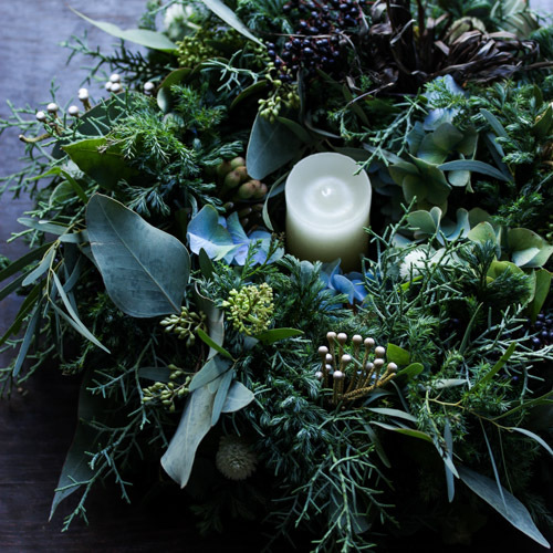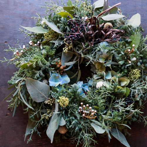 クリスマス・デコレーション[クリスマス紫陽花フレッシュリース]サイズの目安:Φ約35cm(サンプル画像)秋冬限定,ご注文後製作納品(最短一週間以内お届け)