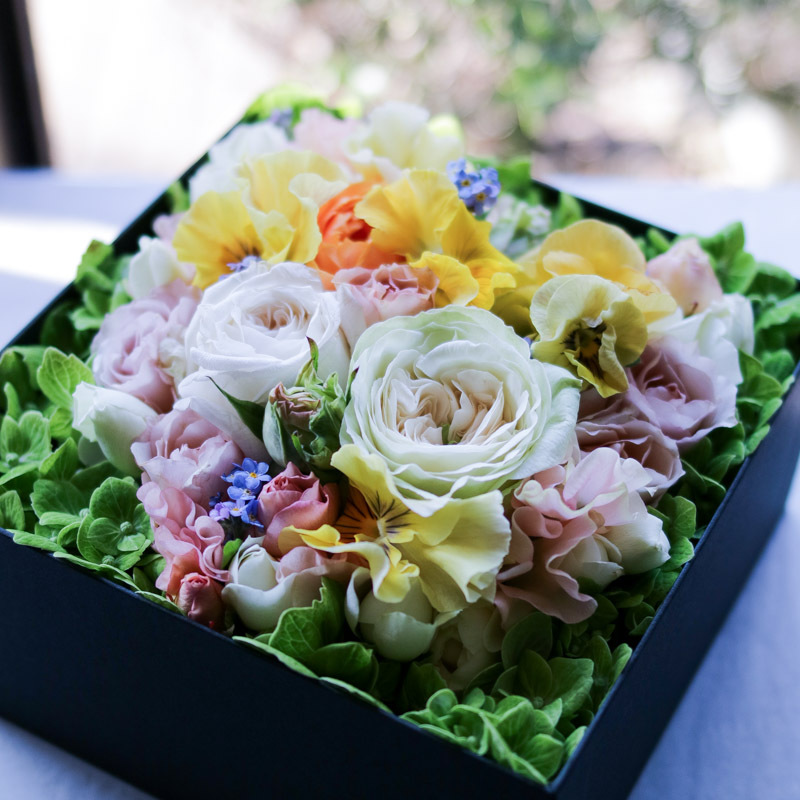 「ボックスフラワー・アレンジメント」は季節の薔薇etcの生花をBoxにアレンジです。専用の手提げ袋に納めてスタイリッシュにプレゼントできます。テーブルにも飾れるタイプです。